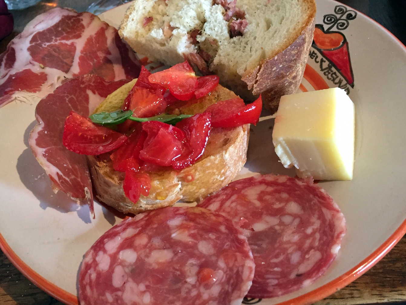 Ok, enough about the water pitcher and back to our lunch. The appetizer consisted of bruschetta with heirloom Piennolo tomatoes (which are tomatoes that are grown on Mount Vesuvius), salami, provolone cheese, and a casatiello (which is a savory, soft bread with bits of meat inside). This appetizer sampler was paired with the Lacryma Christi del Vesuvio Bianco DOP (100% Caprettone), Rosato (100% Piedirosso), and Rosso (100% Piedirosso). Adam and I were not the biggest fans of the Bianco, but we absolutely loved the Rosato and the Rosso. The waitress came over and poured each wine sample the way we were told you must pour wine in Italy: toward your body. If you pour it backhanded, then you are wishing that person bad luck. A lot of Italians take this very seriously, so try not to do it the wrong way!