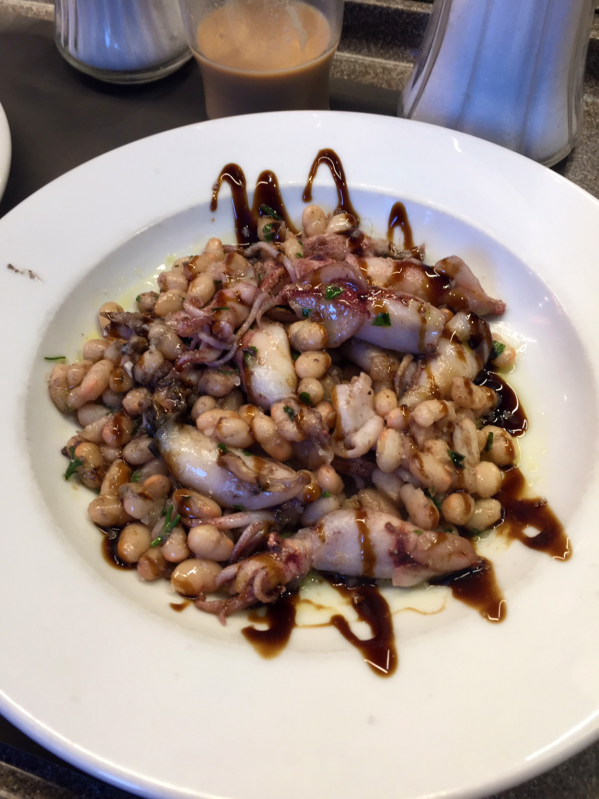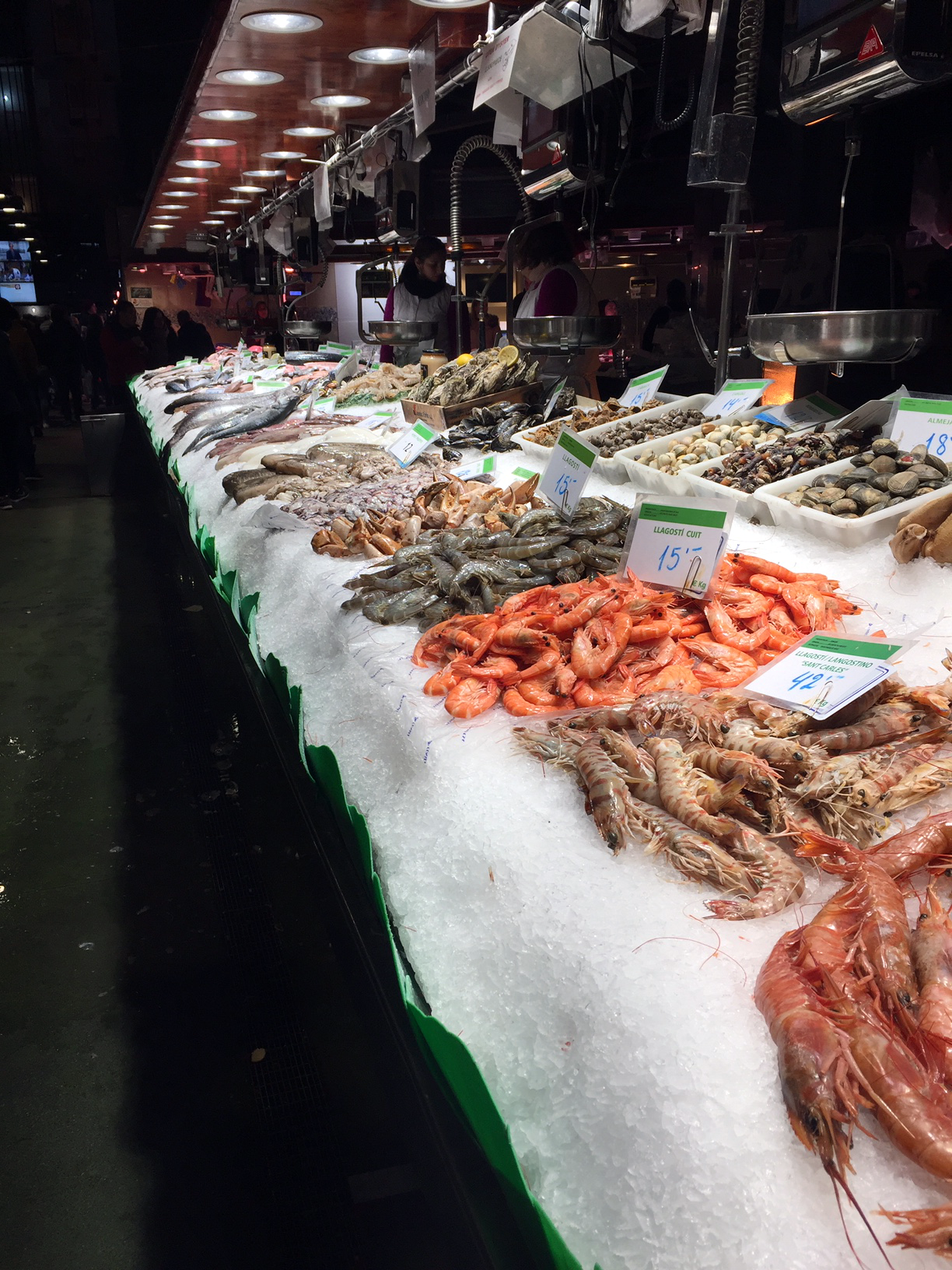 We came across Bar Pinotxo and decided to stop for breakfast. It was delicious. We recommend getting there early if you want a seat because the bar and little tables filled up quickly. Trust us, it’s worth it! The owner was there and he was the sweetest man, wearing an adorable vest and a never-ending smile. At first we weren’t sure what to get, so we started looking around the bar to see what was popular. We could have stayed there for hours eating everything, but we had to choose. We noticed that a lot of people were ordering the xuixo pastry, which had a cream-like filling. Needless to say it was delicious! It was so buttery and wonderfully flaky. Then we started talking to our bar neighbors and asked them what they had. We ended up taking their recommendation for a tripe stew. It was so great and seemed to melt in our mouths with a burst of flavor. Another one of our neighbors told us to get the small squids with garbanzo beans. The combination of sea salt, herbs, and balsamic glaze on top paired so well. Everything we had was so gastronomically impressive. We will be sure to come back and try some other things next time we find ourselves in Barcelona!