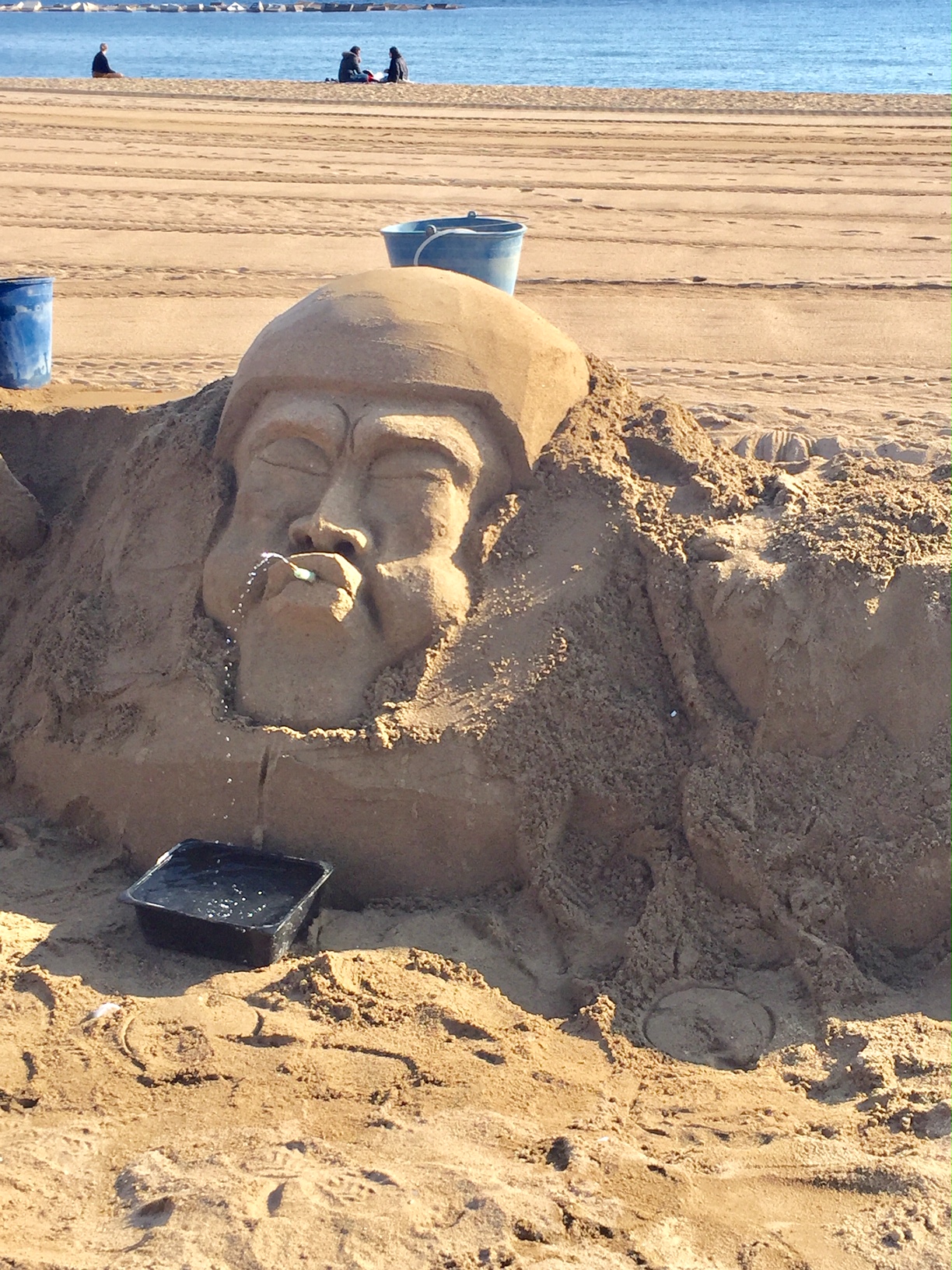 It was a beautiful day for strolling along the port and the beach, and even in January we had a great time. At one point we sat down to look out at the water and enjoy people watching. As we walked along, we noticed a bunch of exquisite sand sculptures. Not only did many of them tell a story, but they had fun interactive elements. One of them was a man spitting out actual water. Another one featured a room with people drinking and sleeping around a fire pit with real fire. Each sculptor clearly put a lot of time into their work and they are constantly thinking of new ideas. They do have a place where you can tip them for their hard work. There were a handful of sculptures in January, but during peak season in the summer, the beach is lined with them. We love that you can enjoy this unique artwork year-round!