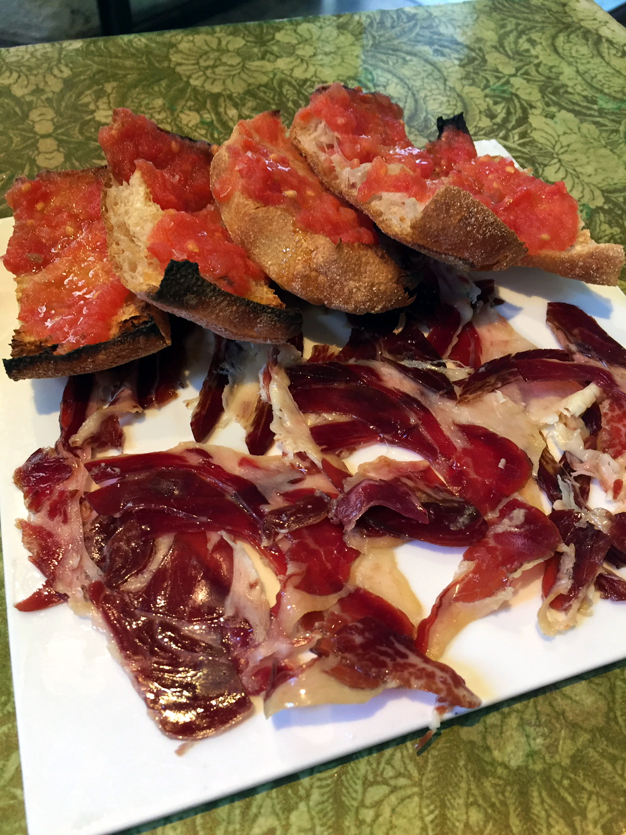 The chef’s partner led us to an unmarked door (no wonder we needed a guide) and we all sat down inside and were given some sangria. Then we went right into learning how to make a tapa. It consisted of a slice of bread, rubbing a tomato on the bread, olive oil, sea salt, cheese, cured meat and a cooked shishito pepper. They were delicious! The ingredients do mean a lot if you want the quality to be superb.