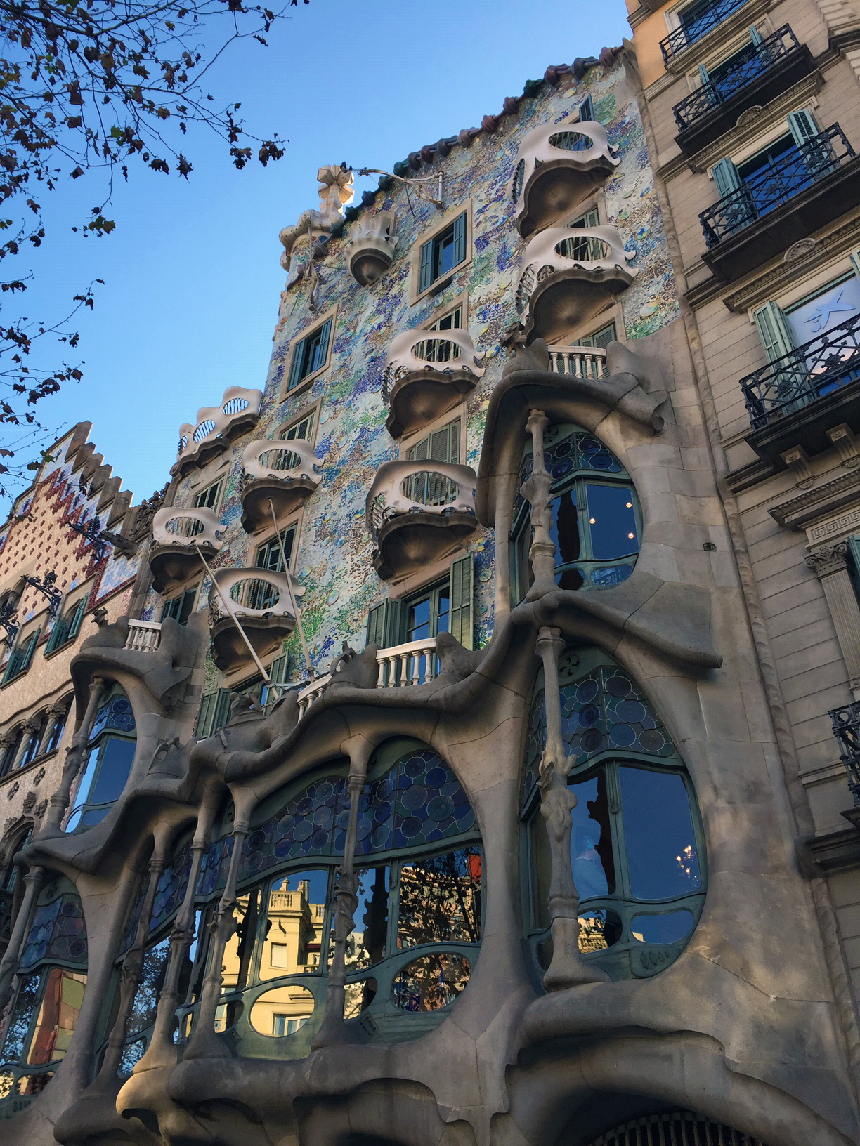 Antoni Gaudí designed the Casa Batlló for Josep Batlló. The house is also called “House of Bones,” with its skeletal features. Batlló gave Gaudí full creative license to design whatever he wanted. Gaudí was inspired by fantasy and nature so we saw a lot of splashes of color. Many people believe the building depicts the legend of Saint George (patron saint of Catalonia), with the tiled roof representing dragon scales, the cross representing the sword going through the dragon’s back, and the skull-shaped balconies representing the dragon’s victims. However, others say the building resembles the aquatic landscape of Monet’s Water Lilies paintings. We encourage you to take a look and decide for yourself.