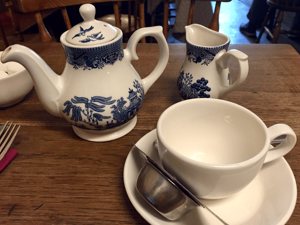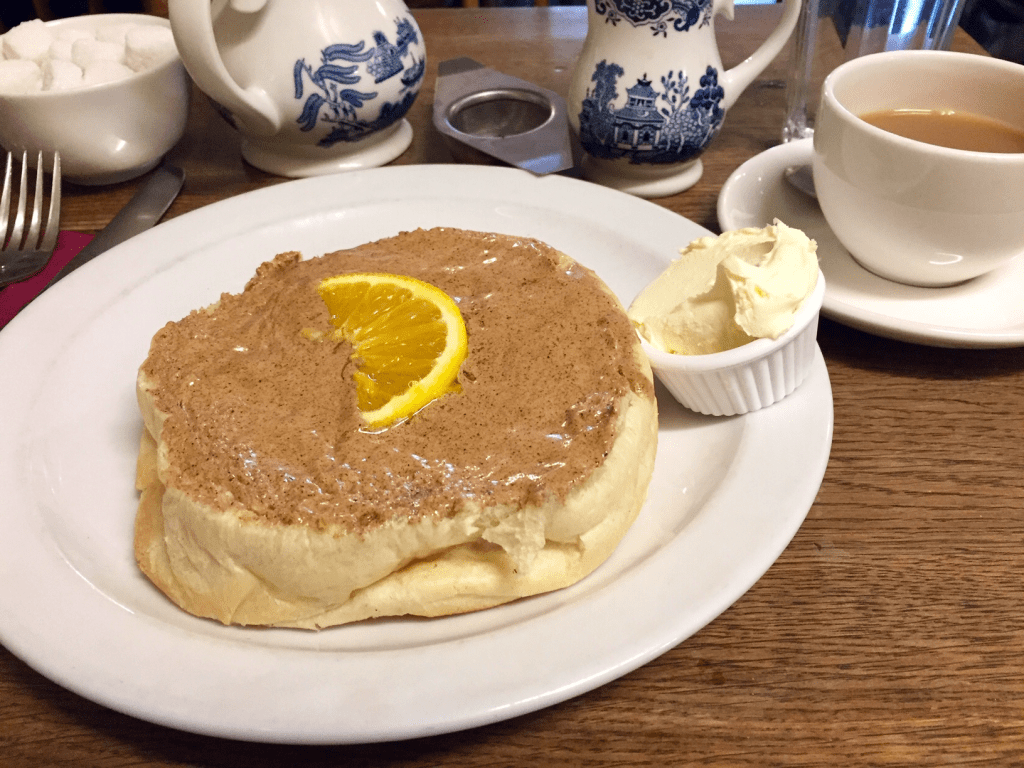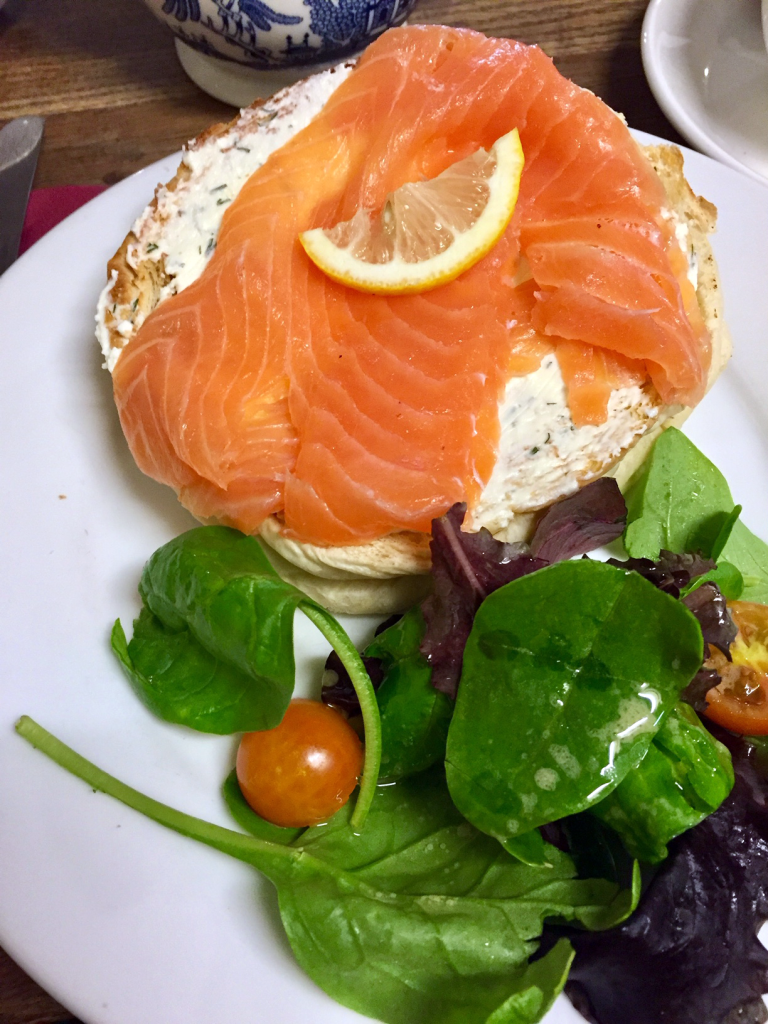 The inside was just as charming as the outside and was a perfect quaint place to have a spot of tea. We started off by having Sally Lunn’s tea blend, which consists of “a subtle blend of Indian, Ceylon & African teas.” It was very tasty and paired well with the cubed sugar and milk. Then we got one savory bun with smoked salmon with cream cheese and a salad. The bun was great and we could see why it works so well as a sweet or savory. Then we had to try a sweet bun. We ended up getting a bun with their homemade/well-known cinnamon butter and we ordered a side of clotted cream to go with it. Not that the dish needed clotted cream, but we just both really like it! Also, this heavy cream is not readily accessible everywhere, so we get it where we can.