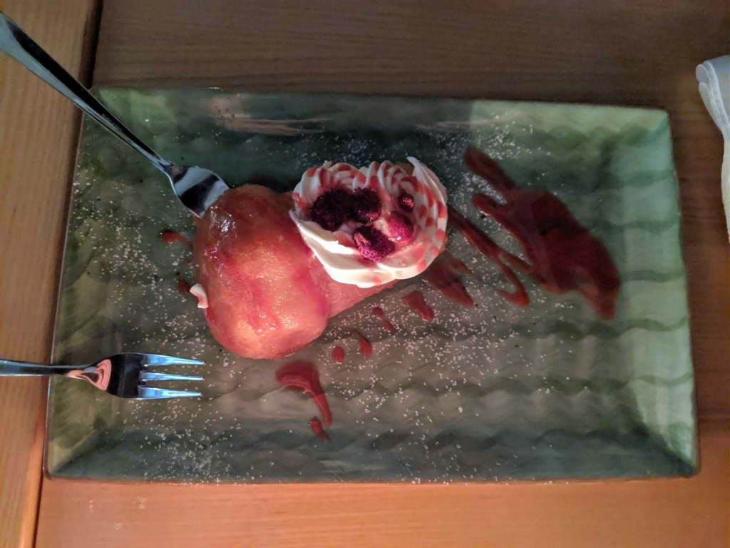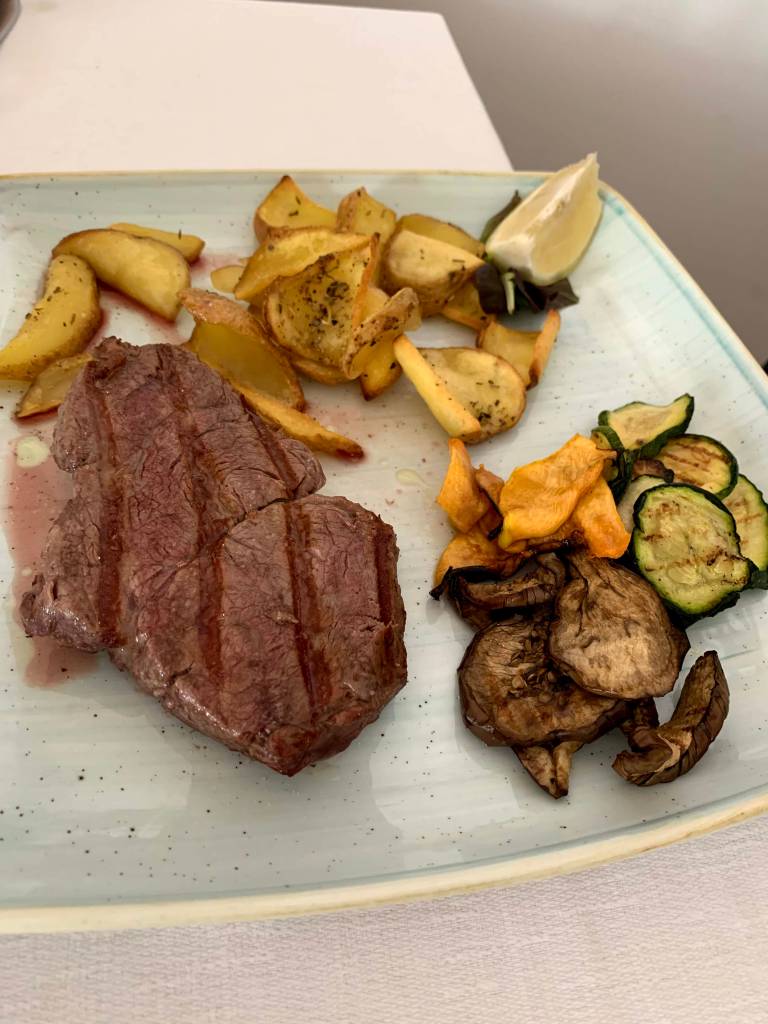 When we arrived, we had lunch at A Paranza. This restaurant was awfully close to the main square and is Michelin-recognized. It’s expensive for dinner, but for lunch they had two special prix fixe menus. We decided to try both! It first came with an antipasto – bruschetta. Then we had our primi, which was a mixed seafood pasta (top left) and a lemon pasta (top right). Both were particularly good. Then we went into secondi: a lemony flaky fish (it was plated beautifully, bottom left) and meat with mixed vegetables (bottom right). We enjoyed it all and it was nice to get a variety.