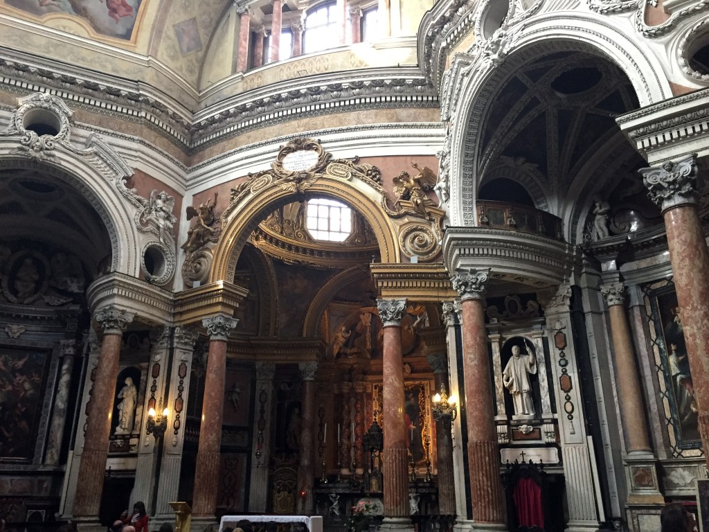 The exterior is nothing to look at, but the interior is where the magic happens. Inside there are some exquisite arches, columns, statues, marbles, and a dome. From outside you would think this church would be dark inside, but in reality it has so much natural light just flooding in from above.