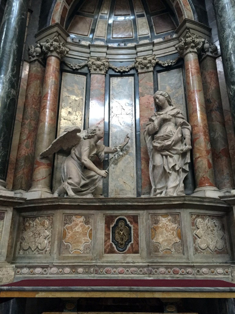 Other things to note when you are inside is the altar and the podium. Notice the beautifully etched figures (specifically you’ll see the Shroud of Turin on the podium). Also, look at where the Eucharist is held because there you will see a gold painted organ and statues on either side of the wooden crucifix that were created by different artists in the 18th century.