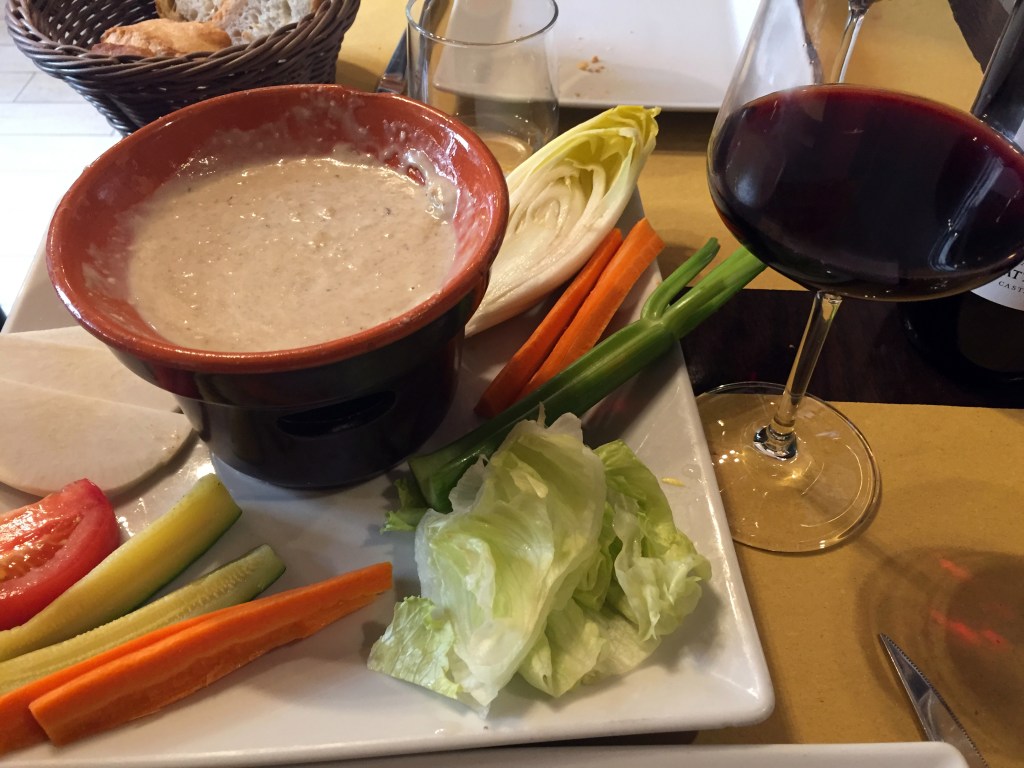 This restaurant also doubles as a café and has a huge selection of wine. You walk in and there are wine boxes and wine scattered all over. We sat in one of the small areas downstairs, but they have more seating upstairs as well, so if you don’t see any seats downstairs, then don’t let that deter you. We started off our lunch by sharing a bottle of red wine (of course one of the B wines – Barbera) and the bagna cauda, which translated means “hot bath.” This appetizer consists of raw (or sometimes cooked) vegetables that you dip in the hot sauce (they keep it hot by adding a little tea light underneath it) that is a blend of olive oil, garlic, and anchovies. This sauce had a very distinct taste. It was something good to try and we liked it, but I can see how it would not be for everyone’s palate. Then we shared a primo, which was a pasta with shaved truffles. This region is known for their truffles and you can even do a tour where they will show you how to hunt for the truffles (we did not do it because it was too pricey for us). For those that have not had truffles, they are mushrooms with an earthy flavor and are a true delicacy in the culinary world. One thing we enjoyed about this restaurant is how they do not skimp on the amount of fresh truffles! Then we shared a secondo, which ended up being blocks of polenta and a beef cut with a gravy type sauce. The Northern part of Italy is well known for their red meats, but this region is known for making polenta and you’ll find it accompanied with a lot of main dishes, as shown in the picture.